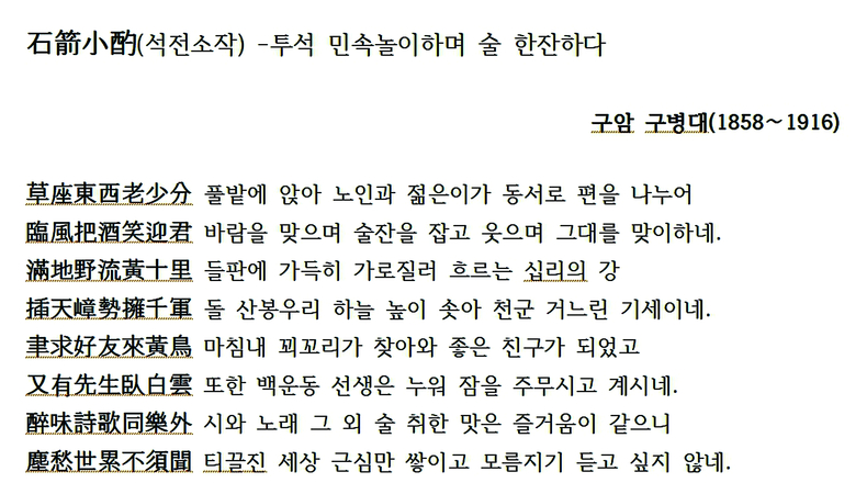 선비 구암 선생은 詩(시)짓고 노래하는 것 이외 술 취한 기분의 즐거움은 같은 것이니 오늘 같이 마을 주민들과 함께 민속놀이하며 이렇게 즐거워야 하는 세상인데, 당시는 티끌지고 어지러운 세상이라 근심만 쌓여가니 그러한 소식을 들으면 마음편안하지 않으니 차라리 듣지 않아서 천방산에 계시는 趙東赫(조동혁)선생 찾아갔을 것이다.