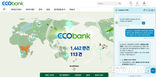 국립생태원(원장 이창석)은 대국민 생태정보 포털서비스인 에코뱅크 홈페이지에 ‘성형 AI 챗봇 서비스’를 11월부터 시범 운영한다고 밝혔다.
