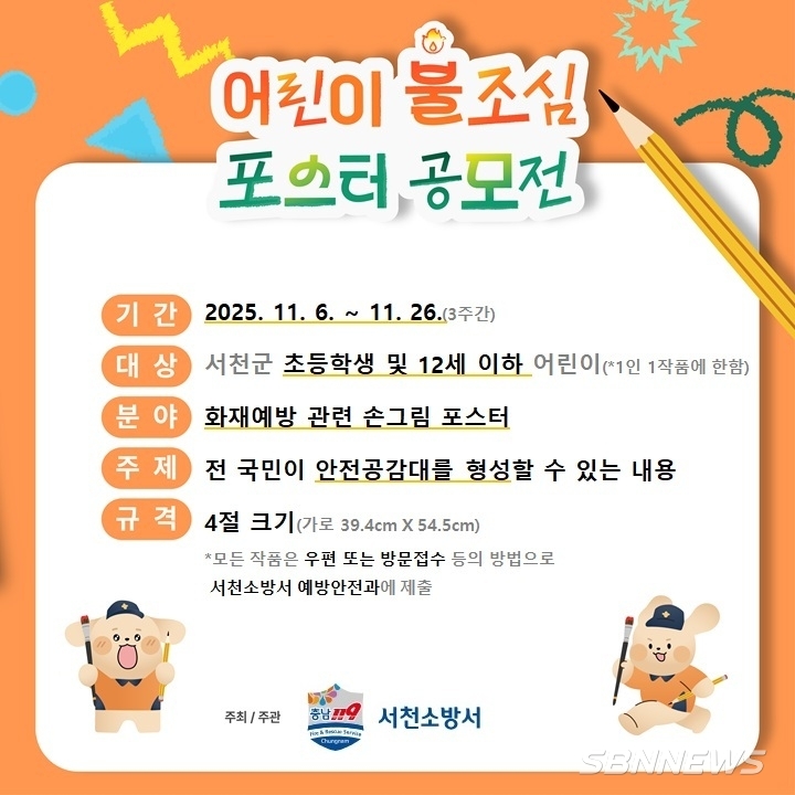 서천소방서(서장 김희규)는 11월 ‘불조심 강조의 달’을 맞아 어린이들의 화재예방 의식을 높이고 안전문화를 확산하기 위해 ‘2025년 어린이 불조심 손그림 포스터 공모전’을 운영하고 있다.