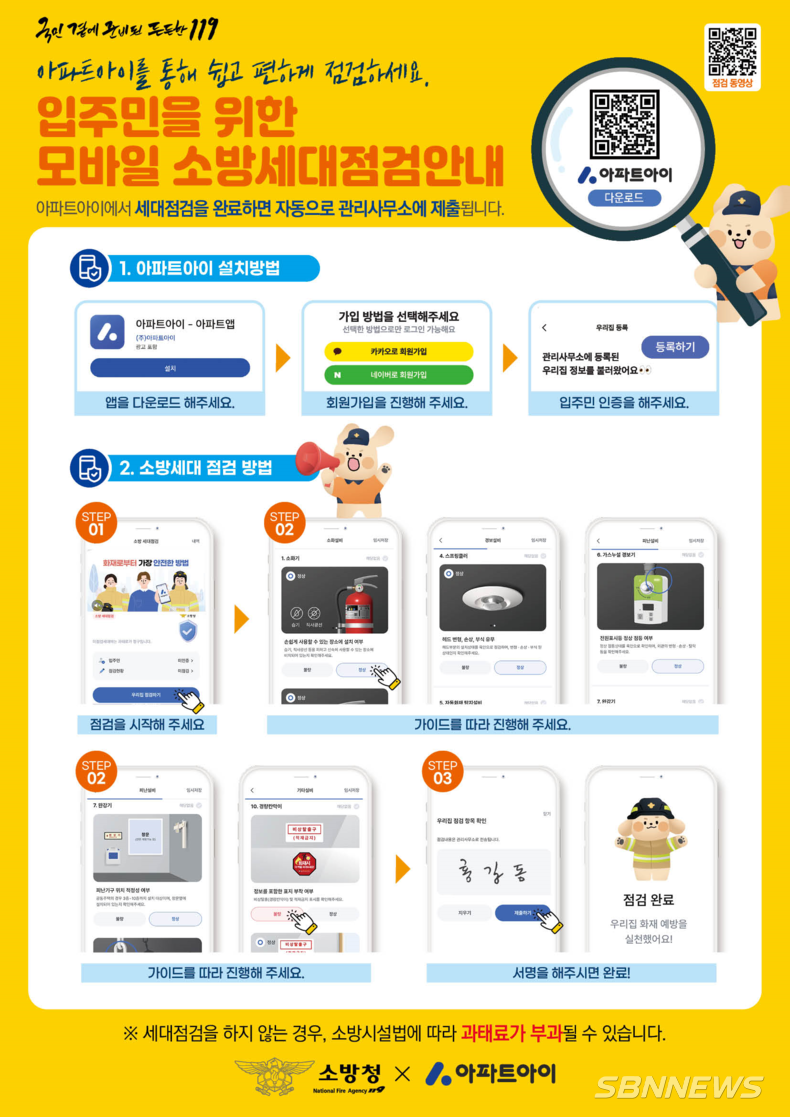 모바일 점검은 ‘아파트아이(Apt-eye)’ 앱을 설치한 뒤 ▲입주민 인증 ▲세대점검 메뉴 선택 ▲소화기·감지기·피난기구 등 항목별 안내에 따라 점검 ▲제출하기 순으로 진행된다.