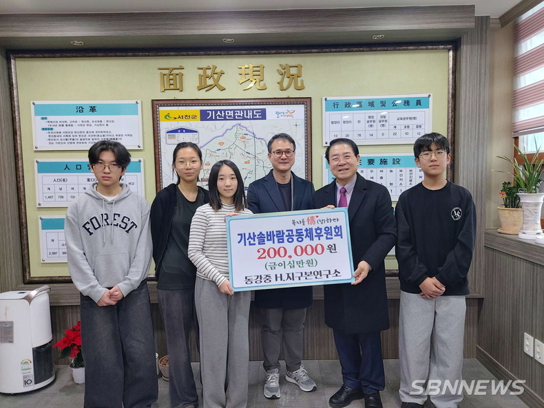 동강중학교 동아리 ‘지구본연구소’ 학생들이 지난 29일 서천군 청소년 정책 제안대회에서 수상하여 받은 상금의 일부를 기산솔바람공동체후원회에 전달했다.