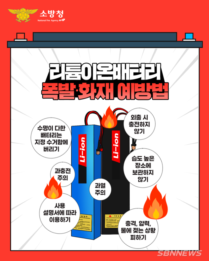 서천소방서는 리튬이온 배터리 안전 사용을 위해 ▲외출 시 충전하지 않기 ▲충격·압력·침수 피하기 ▲습기 많은 장소 보관 금지 ▲과충전·과열 주의 ▲사용설명서에 따른 올바른 사용 ▲수명이 다한 배터리는 지정 수거함에 폐기할 것을 강조했다.
