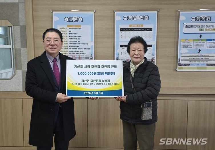 기산초등학교장(이재천)은 지난 3일에 기산초 42회 졸업생인 전 기산면장이셨던 허영선 면장님의 모친이신 설봉례님이 기산초 사랑후원회에 100만원을 기부했다.