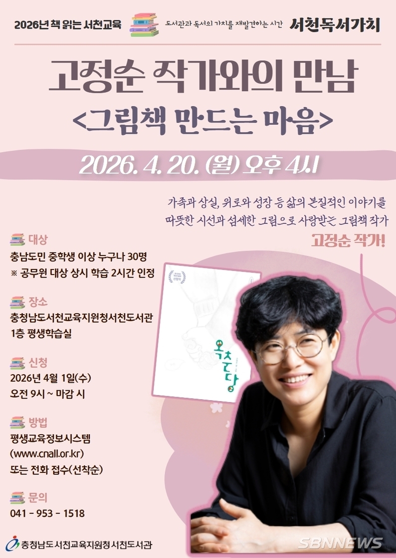 서천도서관(관장 김남희)은 오는 4월 20일 오후 4시 서천도서관 평생학습실에서 고정순 작가와의 만남을 운영할 계획이다.