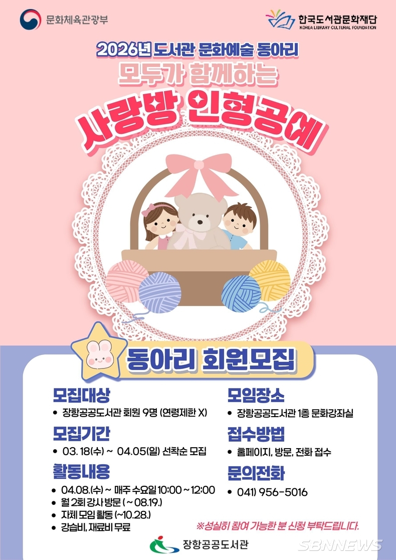 장항공공도서관(관장 박윤미)은 문화체육관광부가 주최하고 한국도서관문화재단이 주관하는‘2026년 도서관 문화예술 동아리 지원 사업’에 선정됐다.
