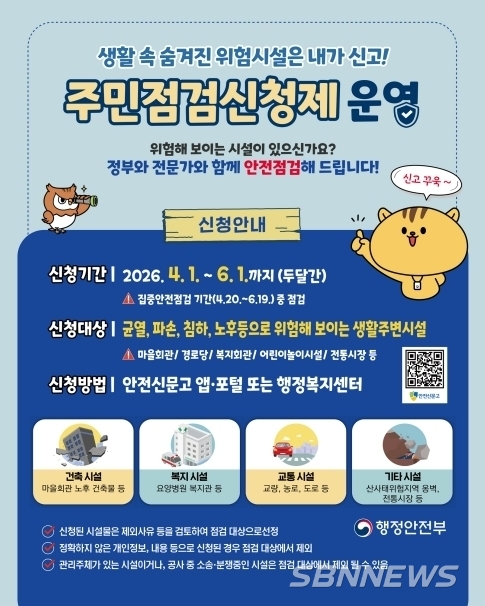 구승완 안전관리과장은 “주민 점검 신청제를 통해 안전 사각지대를 줄여 나가겠다”며 “주민들의 많은 관심과 참여를 바란다”고 말했다.