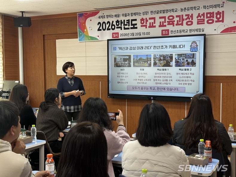 한산초등학교(교장 장태종)는 지난 20일 영어체험실에서 교직원 및 보호자를 대상으로 ‘2026학년도 학교 교육과정 설명회 및 보호자 교육’을 실시했다.