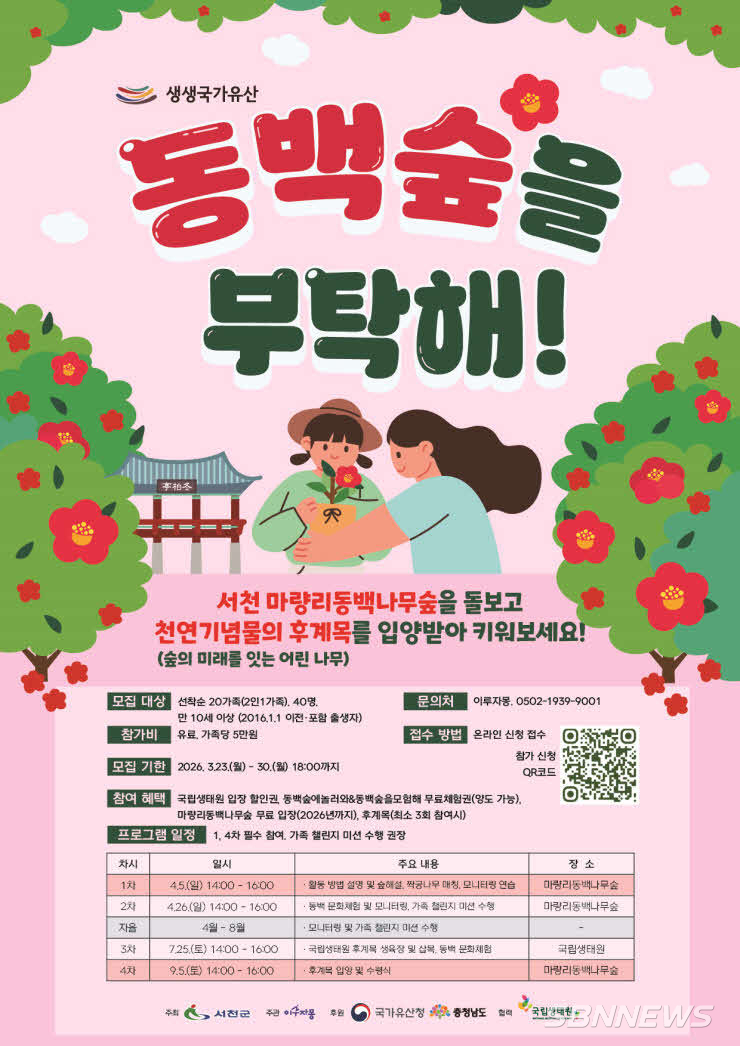 서천군은 2026년 생생국가유산 활용사업의 일환으로 천연기념물인 서천 마량리 동백나무숲을 활용한 참여형 프로그램 ‘동백숲을 부탁해!’를 오는 4월부터 본격 운영한다고 밝혔다.