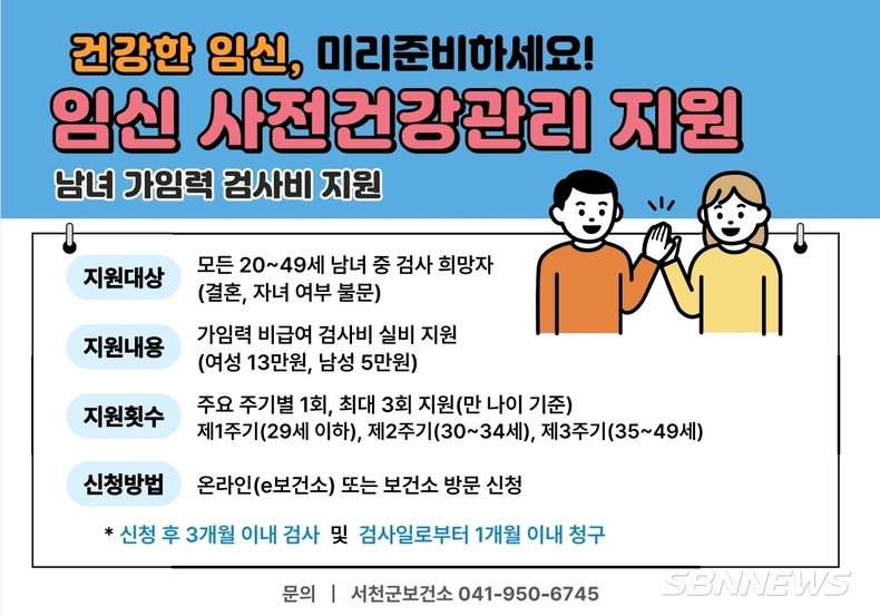 [sbn뉴스=서천] 권주희 기자 = 충남 서천군이 지역 내 예비 부모들의 건강한 임신과 출산을 돕기 위해 팔을 걷어붙였다.