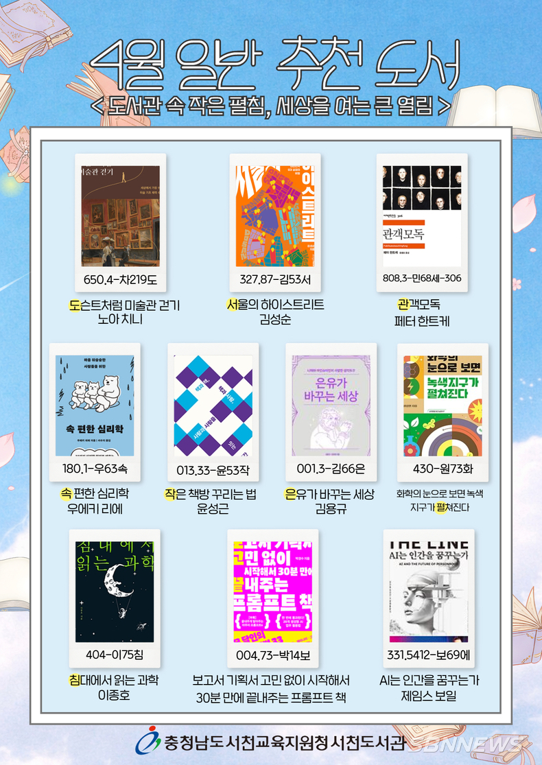 서천도서관(관장 김남희)은 4월 한 달간 자료실과 도서관 누리집에서 ‘이달의 사서 추천 도서’ 전시를 운영한다고.