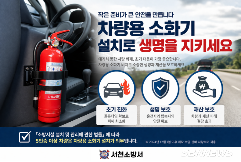 서천소방서(서장 이재명)는 차량 화재 발생 시 신속한 초기 대응을 통한 피해 최소화를 위해 차량용 소화기 비치의 중요성을 적극 홍보하고 있다.