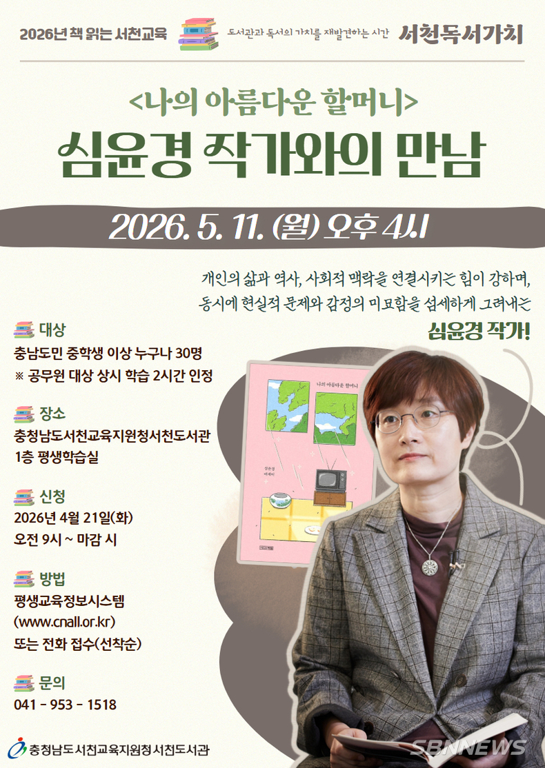 서천도서관(관장 김남희)은 오는 5월 11일 오후 4시 서천도서관 평생학습실에서 심윤경 작가와의 만남을 운영할 예정이다.
