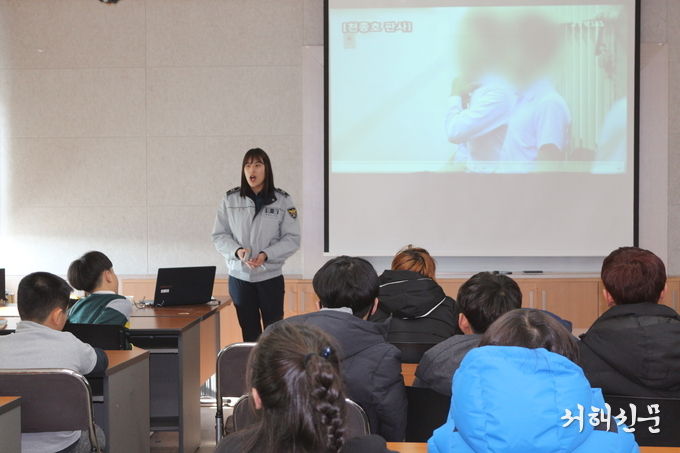 이번 교육은 서천경찰서와 연계, 오정희 순경(여성청소년과 학교전담경찰관)을 초빙해 학교폭력에 대한 정의와 대처방법, 신체폭력과 사이버 폭력 및 채팅앱의 문제점, 언어폭력에 대한 예방법 등을 교육하고 학교폭력이 없는 행복한 학교 만들기를 다짐하는 시간으로 진행됐다.