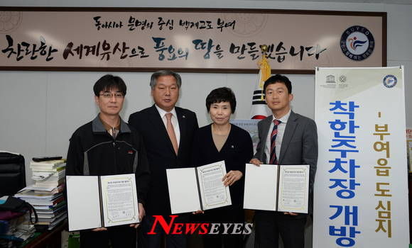부여군(군수 이용우)는 지난 21일 군수실에서 새천년웨딩홀 김천하 대표, 부여행복컨벤션웨딩홀 김연소 대표, 부여웨딩캐슬 조구연 본부장 등이 참석한 가운데 착한주차장 개방 업무협약 체결식을 개최했다.