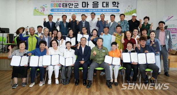 [sbn뉴스=태안] 나영찬 기자 = 충남 태안군은 지난 4일 원북면 갈두천커뮤니티센터에서 군 관계자, 마을대학 수강생 등 총 50여 명이 모인 가운데 ‘2019년 1기 태안군 마을대학 수료식’을 갖고 41명의 마을리더를 배출했다.