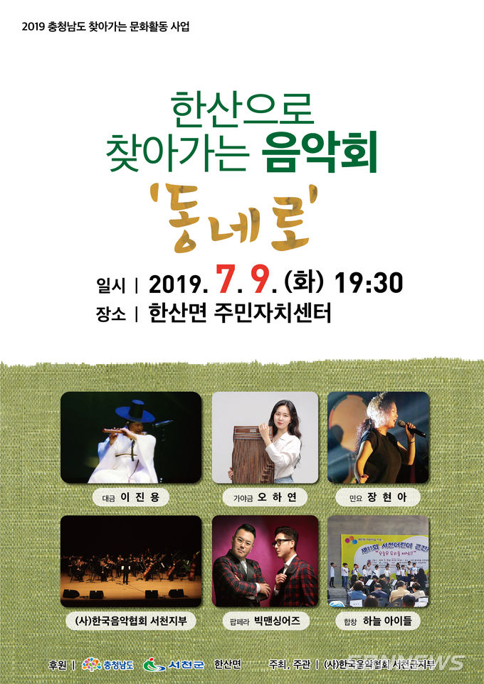 [sbn뉴스=서천] 나영찬 기자 = (사)한국음악협회 충남 서천군지부가 오는 9일 오후 7시 30분에 한산면 주민자치센터에서 찾아가는 음악회 ‘동네로’를 진행한다.