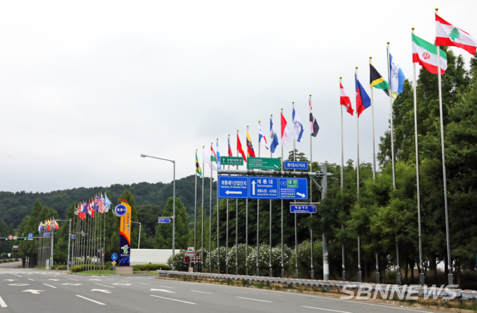 [sbn뉴스=계룡] 김호진 기자 = 충남 국방도시 계룡시의 관문인 계룡IC 진입로에 6.25전쟁 참전국 및 지원국가의 국기가 내걸렸다.