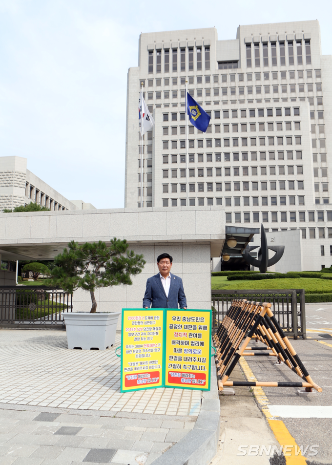 [sbn뉴스=논산] 김호진 기자 = 충청남도 시·군의회 의장협의회(회장 김진호, 논산시의회 의장)는 지난 19일 오전 8시 30분 서울 서초구 대법원 정문 앞에서 ‘당진·평택항 매립지 충남 귀속 결정’촉구를 위한 1인 피켓 시위에 나섰다.