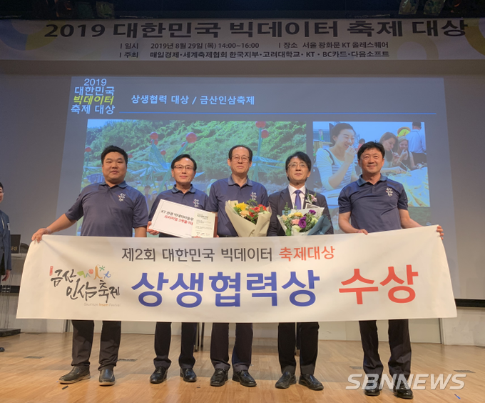 [sbn뉴스=금산] 김호진 기자 = 지난 29일, 서울 광화문 KT 올레 스퀘어에서 개최한 ‘제2회 대한민국 빅데이터 축제대상’에서 금산인삼축제가 ‘상생협력대상’을 수상하는 쾌거를 이뤘다.