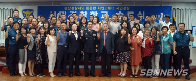 [sbn뉴스=논산] 김호진 기자 = 충남 논산경찰서(서장 장창우)가 공동체 치안활성화를 위해 5일 오후 7시 경찰서 황산마루에서 경찰서장 및 김태현 시민경찰연합대장 등 약 60여명이 참여한 가운데 ‘제8기 시민경찰학교 수료식’을 개최했다.