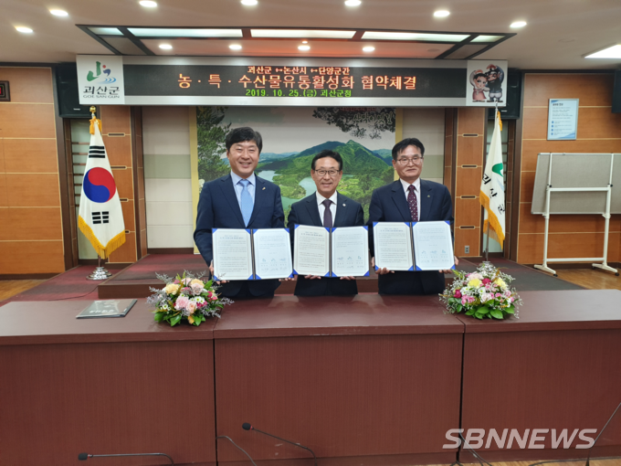 황명선 논산시장은 25일 괴산군청에서 열린 ‘농·특·수산물 유통활성화 협약식’에 참석해 이차영 괴산군수, 최성회 단양부군수와 함께 각 지역의 대표 농·특·수산물의 안정적 유통망 구축으로 지역 경제 활성화는 물론 지방지방정부 간 상생발전을 도모할 것을 약속했다.
