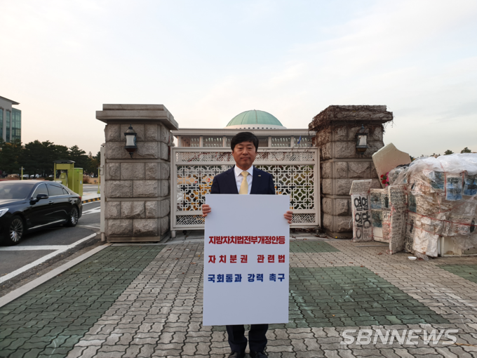 [sbn뉴스=논산] 김호진 기자 = 황명선 충남 논산시장(전국시장군수구청장협의회 공동대표)이 지난 12일 국회 정문 앞에서 국회에 계류 중인 자치분권 관련 법안의 통과를 촉구하며 목소리를 높였다.