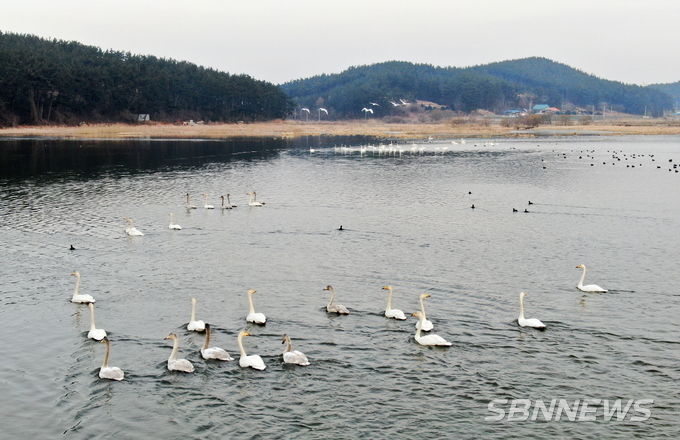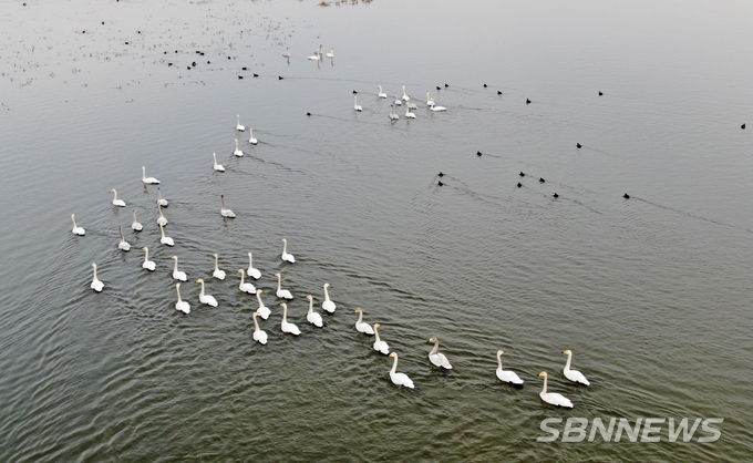 [sbn뉴스=태안] 나영찬 기자 = 충남 태안군 근흥면 마금리 수룡저수지에 천연기념물 제201-2호인 큰고니 100여 마리가 찾아와 우아한 자태를 뽐내고 있다.