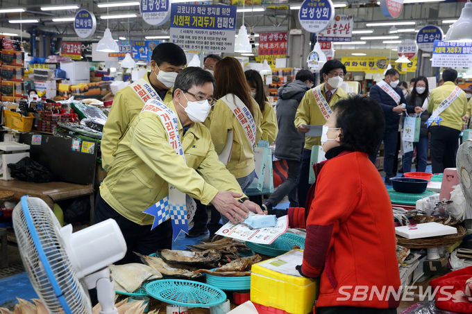 [sbn뉴스=서천] 신혜지 기자 = 충남 서천군은 지난 12일 서천특화시장에서 코로나 확산 방지를 위한 ‘사회적 거리두기’ 캠페인을 실시했다.