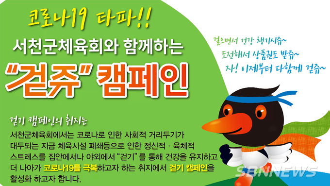충남 서천군체육회가 코로나19 소멸 시까지 ‘하루에 일만보 일주일 챌린지’ “걷쥬”캠페인을 진행합니다.