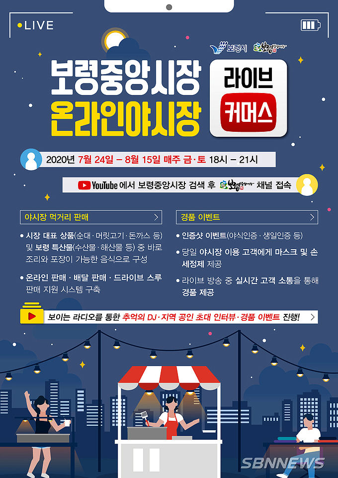 [sbn뉴스=보령] 나영찬 기자 = 충남 보령시가 내달 15일까지 매주 금요일과 토요일 오후 6시부터 저녁 9시까지 '보령중앙시장 온라인 야시장'을 운영한다.