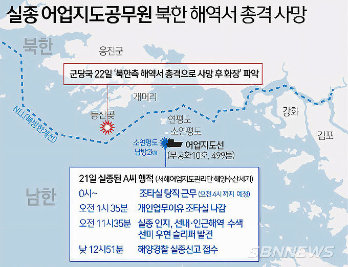 [sbn뉴스=세종] 윤석민 기자 = 지난 21일 서해 북방한계선( NLL)과 인접한 연평도 인근 소연평도 해상에서 실종된 해양수산부부 소속 어업지도 공무원 A씨(47)는 북한군의 총격으로 사살된뒤 불태워진 것으로 알려져 충격을 던지고 있다.