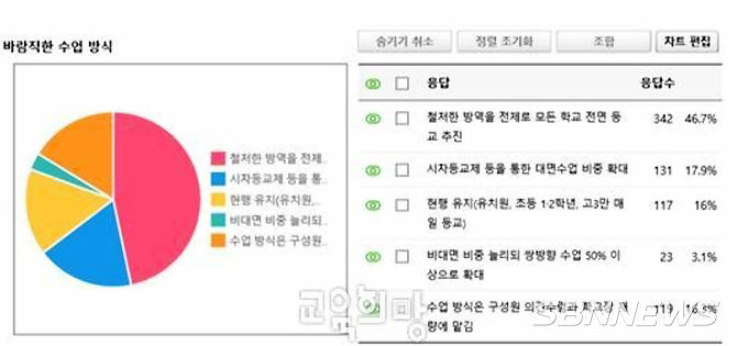 이어 '수업 방식을 구성원 의견과 학교장 재량에 맡겨야 한다'는 의견은 16.3%(119명)로 집계됐다.