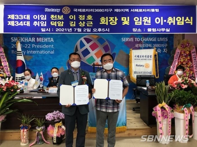 서해로타리클럽에 새로 취임한 김상근 회장과 협의체 김형천 민간위원장이 서명한 협약서에는 지역 내 저소득가정에 후원물품을 전달하는‘희망나눔 물품지원’ 사업에 로타리클럽에서 매월 후원사업을 펼칠 예정이라는 내용이 담겨있다.