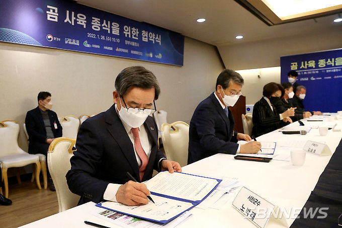 ![지난 26일 정부서울청사에서 환경부와 충남 서천군, 전남 구례군, 사육 곰협회, 시민단체의 ‘곰 사육 종식 선언을 위한 협약식’ 체결 모습. [사진=서천군]](http://www.sbnnews.co.kr/data/photos/20220104/art_1643278257378_4452cb.jpg)
