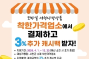 [sbn뉴스-서해신문·서해방송] 군, 착한가격업소 모바일 상품권 결제 시 최대 15% 혜택 제공 등 25일 충남 서천군 군정소식을 전한다. ◇서천군, 착한가격업소 모바일 상품권 결제 시 최대 15% 혜택 제공 - 소비자·소상공인 모두 웃는 착한가격업소 만들기 총력 서천군은 고물가로 인한 군민 생활비 부담을 덜고 지역 소상공인과의 상생을 도모하기 위해 오는 4월 1일부터 12월 20일까지 ‘착한가격업소 모바일 서천사랑상품권 추가 지원사업’을 시행한다. 지원 대상은 서천군 내 착한가격업소 중 모바일(카드) 서천사랑상품권 가맹점이며, 연매출 30억원을 초과하는 상품권 가맹점은 제외된다. 착한가격업소 현황은 서천군청 누리집 내 ‘분야별정보 > 생활정보 > 착한가격업소’에서 확인할 수 있다. 이번 사업에 따라 착한가격업소에서 모바일(카드) 서천사랑상품권으로 결제할 경우, ‘지역사랑상품권 Chak’ 앱을 통해 결제금액의 3%를 추가 캐시백으로 지원받을 수 있다. 기존 할인율까지 포함하면 최대 15%의 혜택이 제공되며, 예산 소진 시 조기 종료될 수 있다. 이와 함께 군은 매월 첫째 주 수요일을 ‘착한가격업소 이용의 날’로 지정해 공직자와 군민의 참여를 유도하